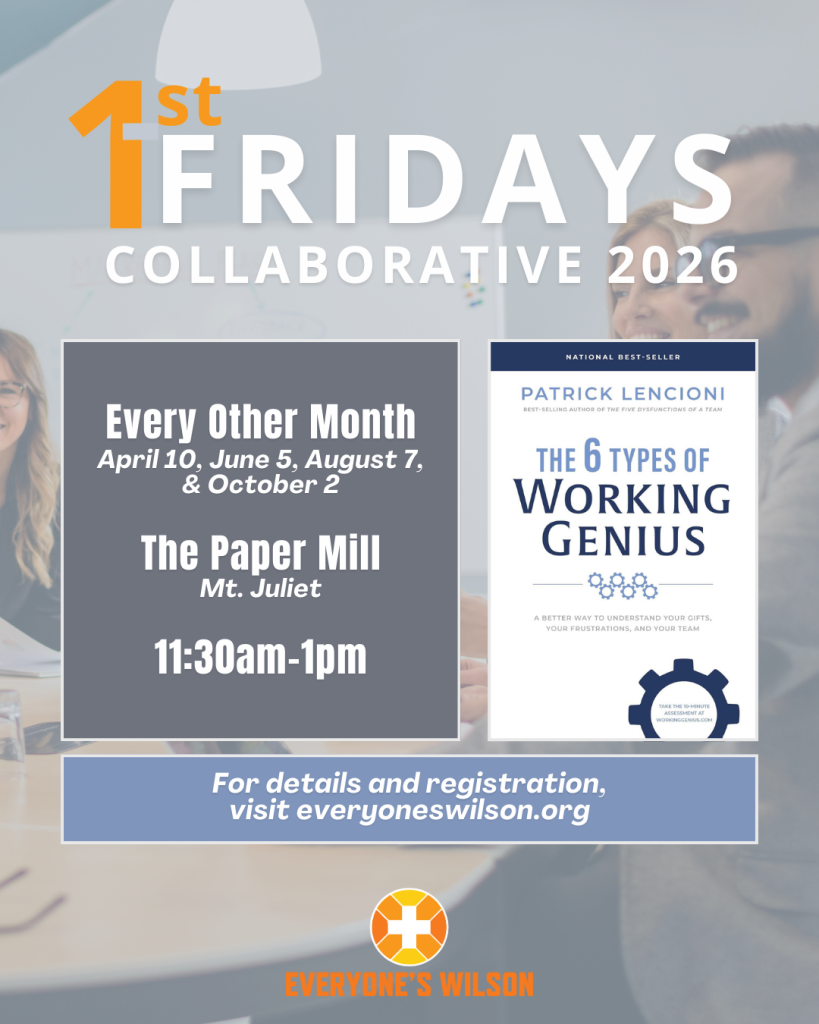 UPCOMING Events Check out where Everyone’s Wilson will be making an impact — we’d love for you to join us! RSVP St. Patrick’s GalaTuesday, March 17th Event Details First Fridays Collaborative Every Other Month11:30am-1pmThe Paper Mill, Mt. Juliet Register